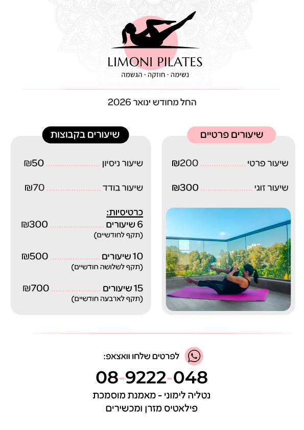 אצלנו תמצאו אימוני פילאטיס מזרן מותאמים אישית, בקבוצות קטנות ואווירה אינטימית. השילוב המושלם בין חיזוק, הארכה ושיקום – כדי שתוכלו להרגיש קלילים, חזקים ובריאים יותר בכל יום.